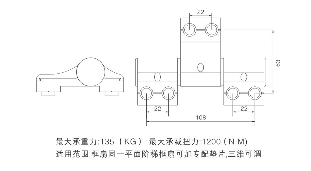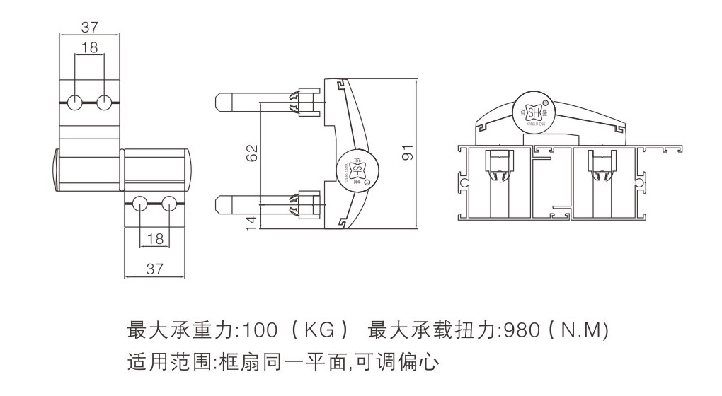 適用于框扇同一平面型材上,可調偏心,每對最大承重100(KG),最大承載扭力980(N.M)
