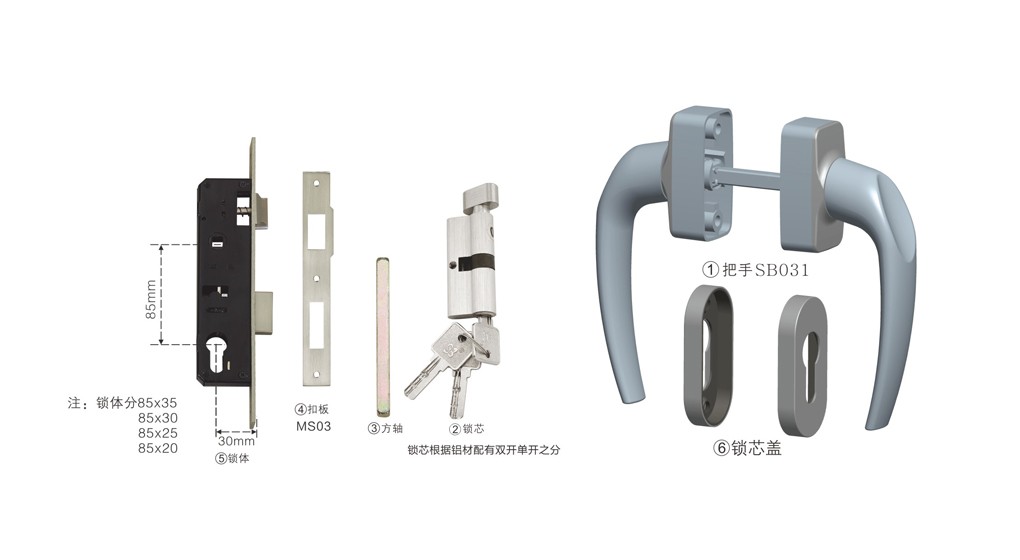 平開門鎖,把手與鎖芯蓋分體設(shè)計(jì)。實(shí)用簡潔大方。鎖芯、扣板可按客戶需求選配。