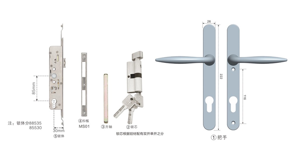 • 產品描述: 平開門鎖,實用簡潔大方。鎖體連接傳動桿可實現多點鎖。扣板可按客戶需求選配。